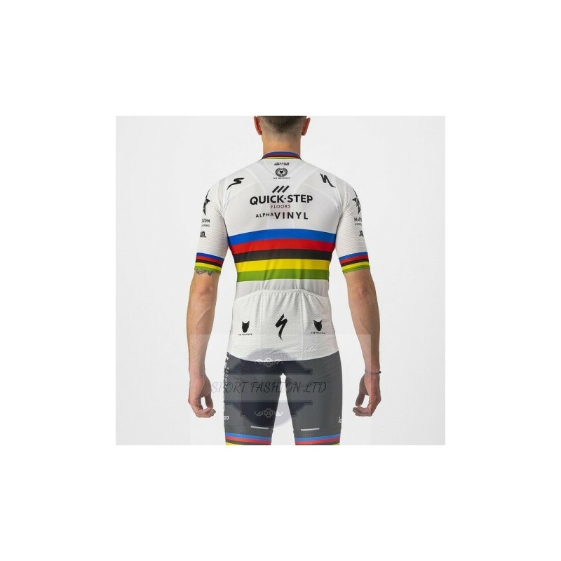 Koszulka posiada panelową konstrukcję poprawiającą cyrkulację powietrza, a spodenki wyposażone są w wygodną wkładkę żelową, która sprawdza się zarówno na krótkich treningach, jak i wielogodzinnych trasach. Całość utrzymana jest w charakterystycznej stylistyce zespołu Soudal–Quick Step, dzięki czemu zestaw prezentuje się profesjonalnie i dynamicznie.